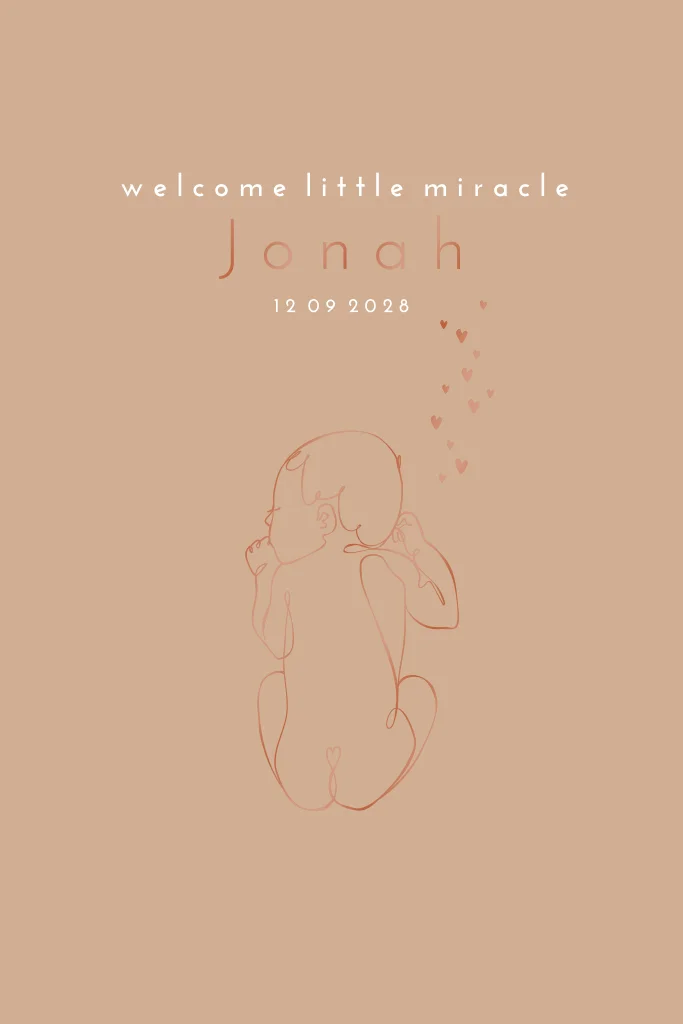 Lief, tijdloos en hip geboortekaartje voor een jongen met een baby illustratie in koperfolie. De rest van het ontwerp is clean en minimalistisch voor een maximale uitstraling:) Foliekleur kan je eenvoudig aanpassen , goud staat ook mooi !