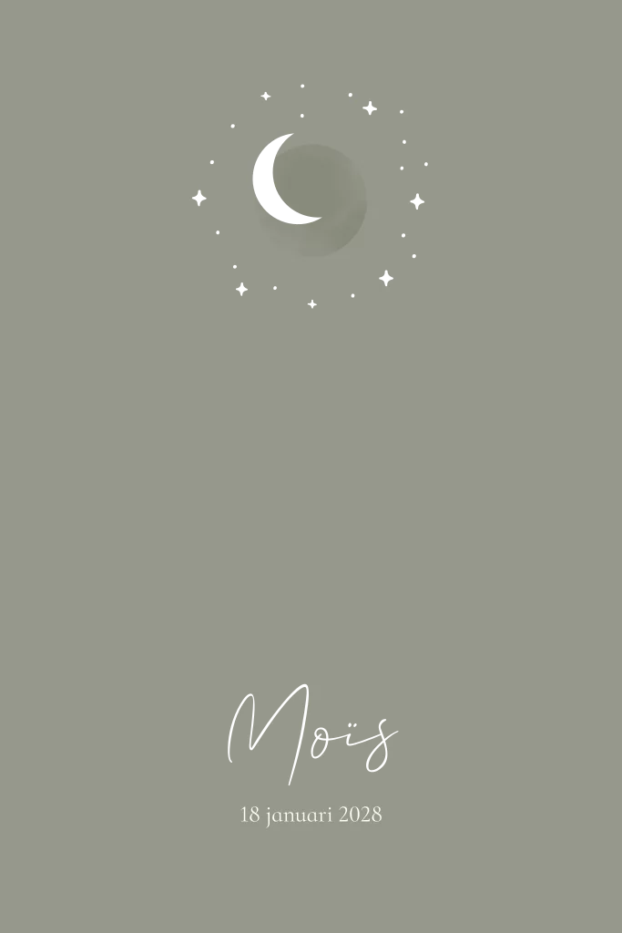 Minimalistisch geboortekaartje voor een jongen met maan en sterren in goudfolie. Stoer en neutraal met de kleur groen. je kan eenvoudig zelf het geboortekaartje aanpassen met teksten en achtergrond zoals bijvoorbeeld linnen. Met een lief gedichtje op de achterkant.