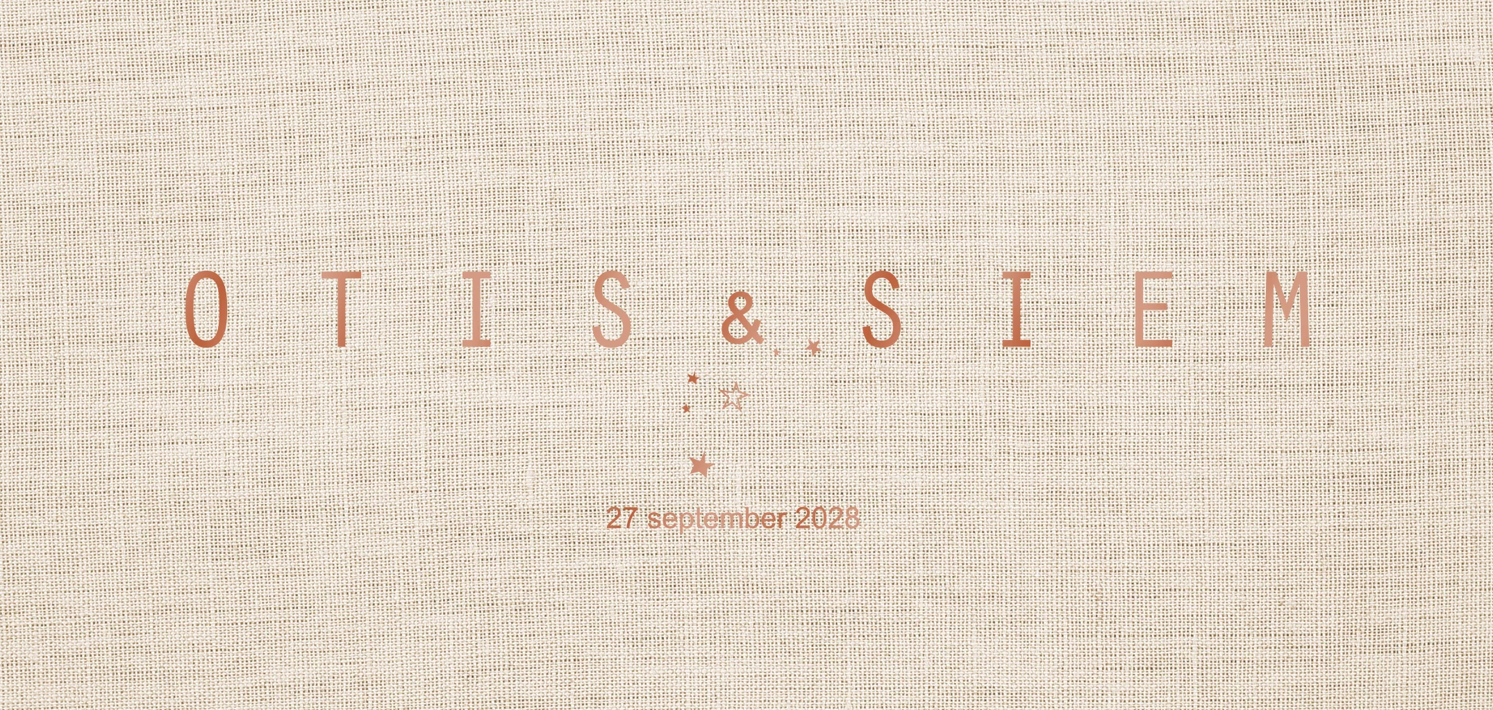 Minimalistisch ontwerp geboortekaartje voor een tweeling jongen met hoogglans folie en sterretjes en sterrenbeeld op de achterkant. Je kan zelf de details en de folie kleur online aanpassen in de ontwerptool en met illustraties uit de mappen.