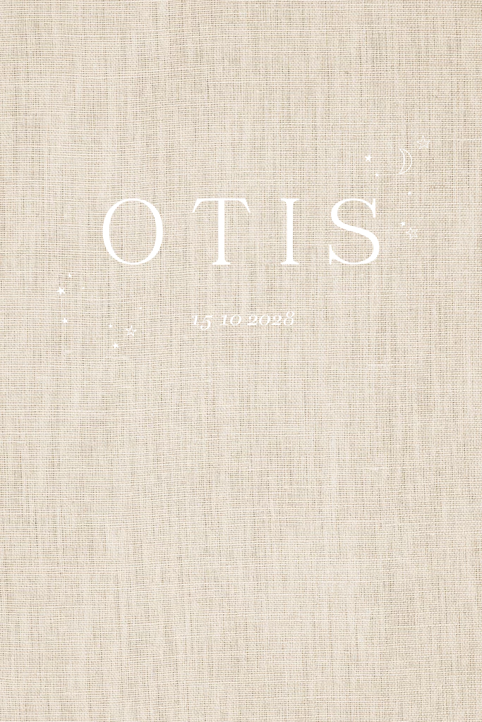 Stoer minimalistisch geboortekaartje voor een jongen met linnen achtergrond. Met de naam van je zoon in goudfolie geeft een extra luxe uitstraling aan het kaartje. Je kan eenvoudig zelf alle details, lettertype en kleur folie aanpassen in de online editor. leuk om te combineren met een baby foto labeltje