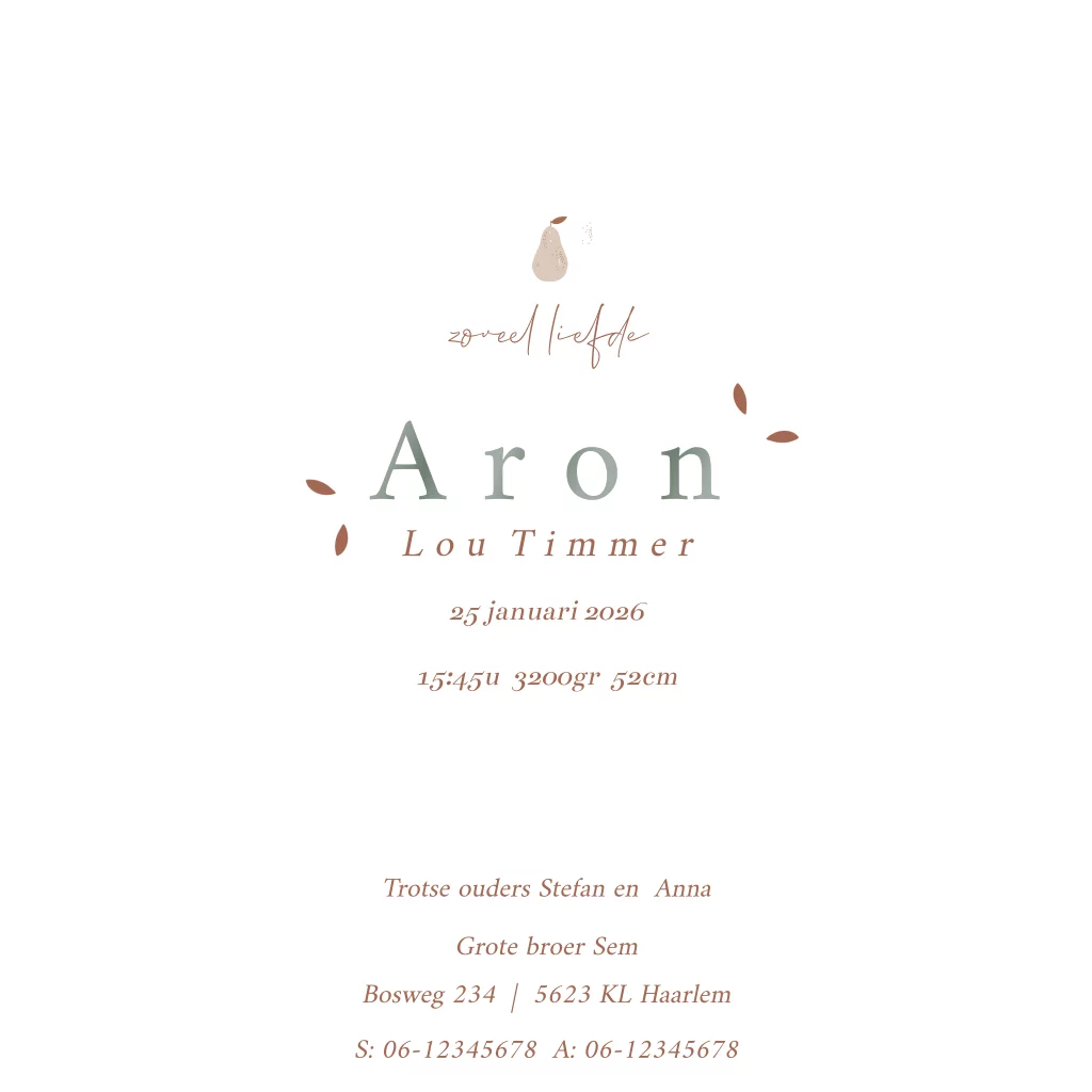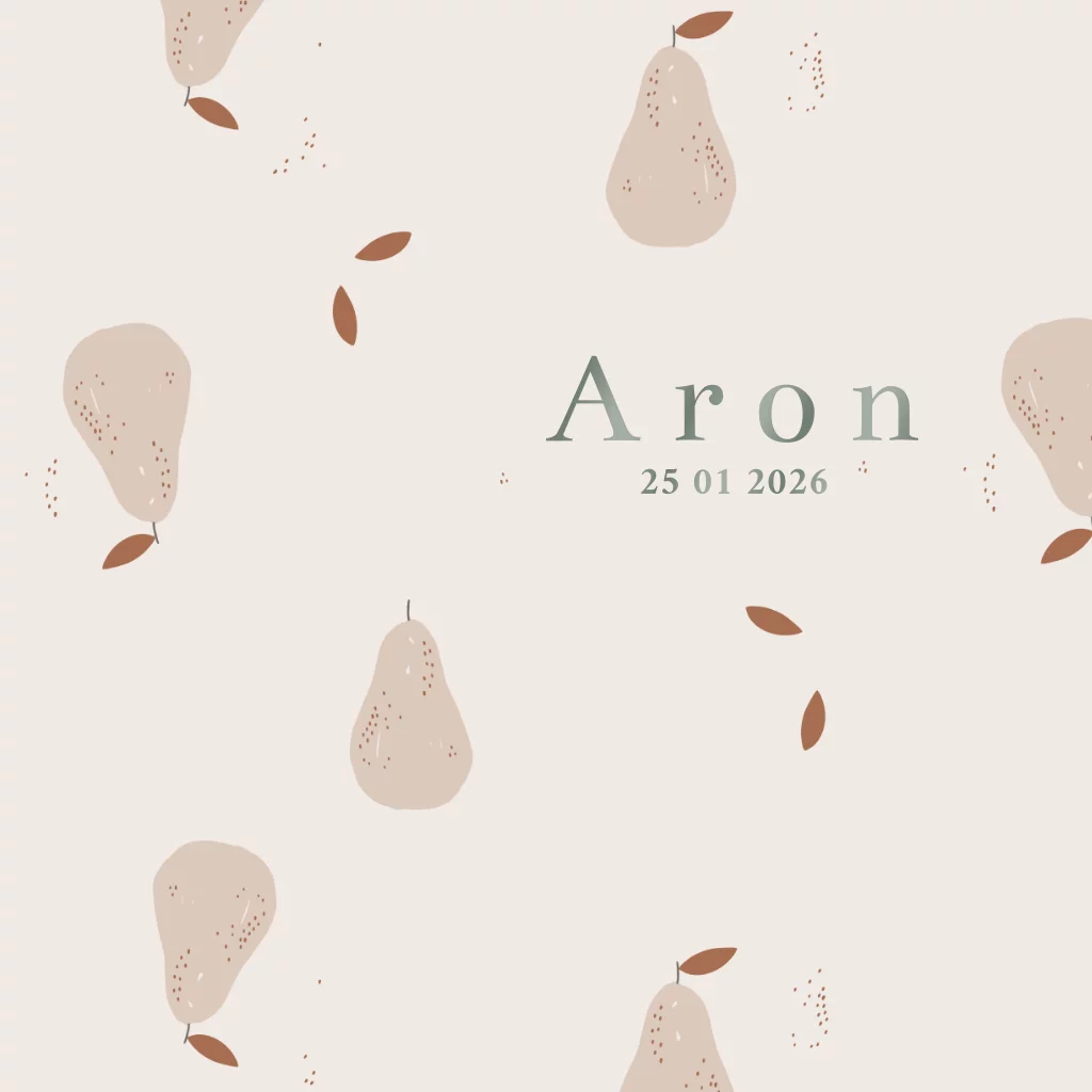 Te lief geboortekaartje voor een jongen met een peren patroon. Je ziet de peer op dit moment ook veel terugkomen in accessoires voor de babykamer. Met de neutrale kleuren een lief tijdloos geboortekaartje. De contrasterende hoogglans foliekleur geeft een extra verrassende uitstraling aan dit bijzondere ontwerp. Je kan eenvoudig de achtergrondkleur aanpassen. Maak de geboorteaankondiging compleet met een raambord en een kraambezoekboek in de stijl van het geboortekaartje.