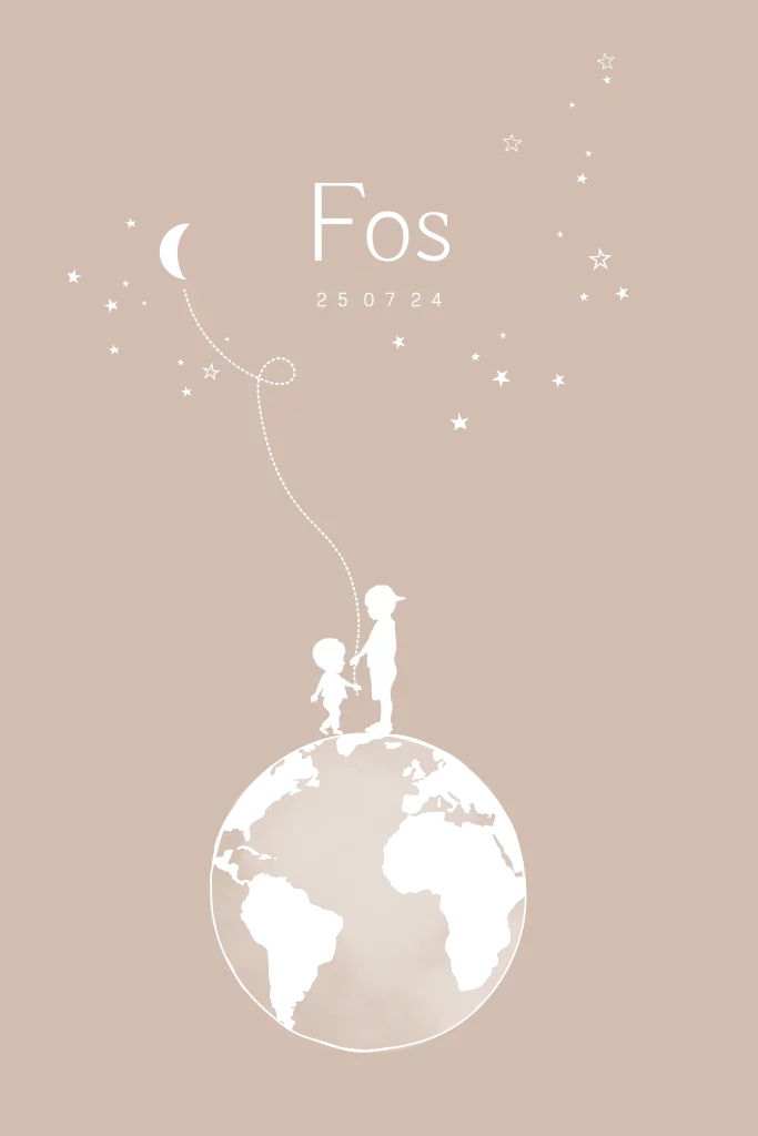 Wereldkaart geboortekaartje , stoer met broertjes silhouet en subtiele sterretjes en maan in folie. Ander silhouetje erbij? Ze staan allemaal in de illustratie mappen en kom je er niet uit? Neem gerust contact op en wij passen het kosteloos aan.