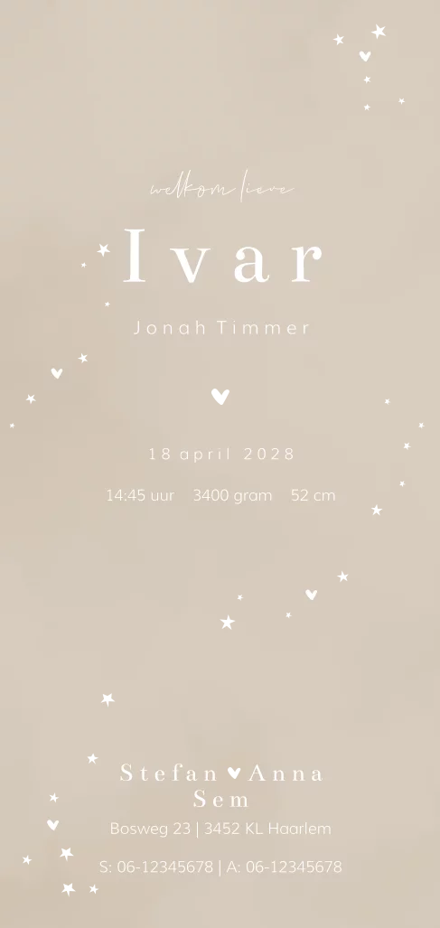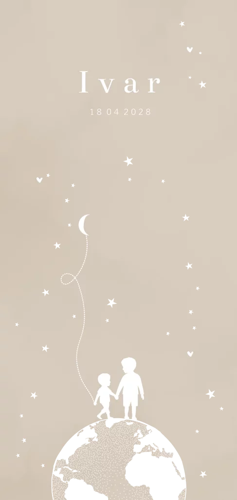 De watercolour achtergrond in de neutrale kleur geeft meteen een stoere uitstraling een dit originele geboortekaartje voor een jongen. De wereldbol in goudfolie en het silhouet van een jongen met broertje is bijzonder met de maan als ballon. Wil je er een broertje of zusje bij plaatsen ? Die staan klaar in de illustratie map en zijn eenvoudig toe te voegen.
