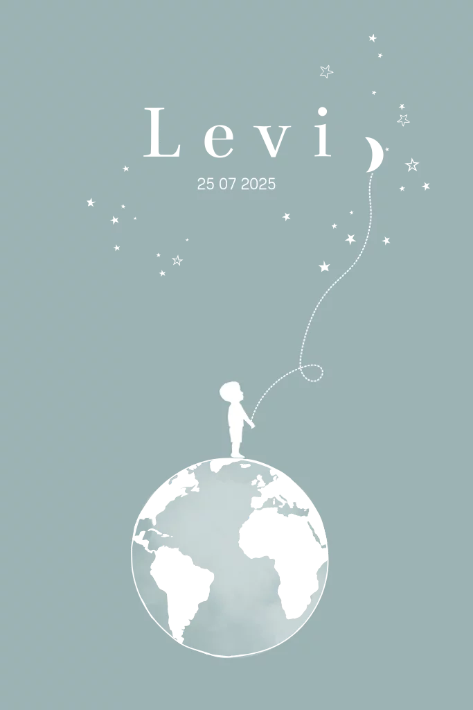 Origineel geboortekaartje voor een jongen, stoer met silhouet en subtiele sterretjes in folie. De wereldbol is een trend die helemaal past bij deze stijl. Je kan eenvoudig een broertje of zusje toevoegen en de foliekleur wijzigen met de editor. Leuk geboortegedichtje op de achterkant.