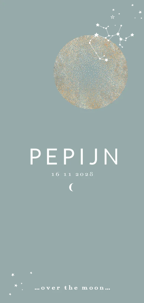 Bijzonder origineel babykaartje voor een jongen. De trend van nu is goudfolie sterretjes en maan. Zo Mooi combineert deze met het sterrenbeeld in folie voor een uniek ontwerp.
