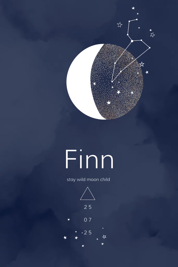 Bijzonder origineel geboortekaartje voor een jongen met de maanstand waarin jullie kindje is geboren met het sterrenbeeld en element voor een uniek ontwerp. De goudfolie details zijn een echte eye-catcher !