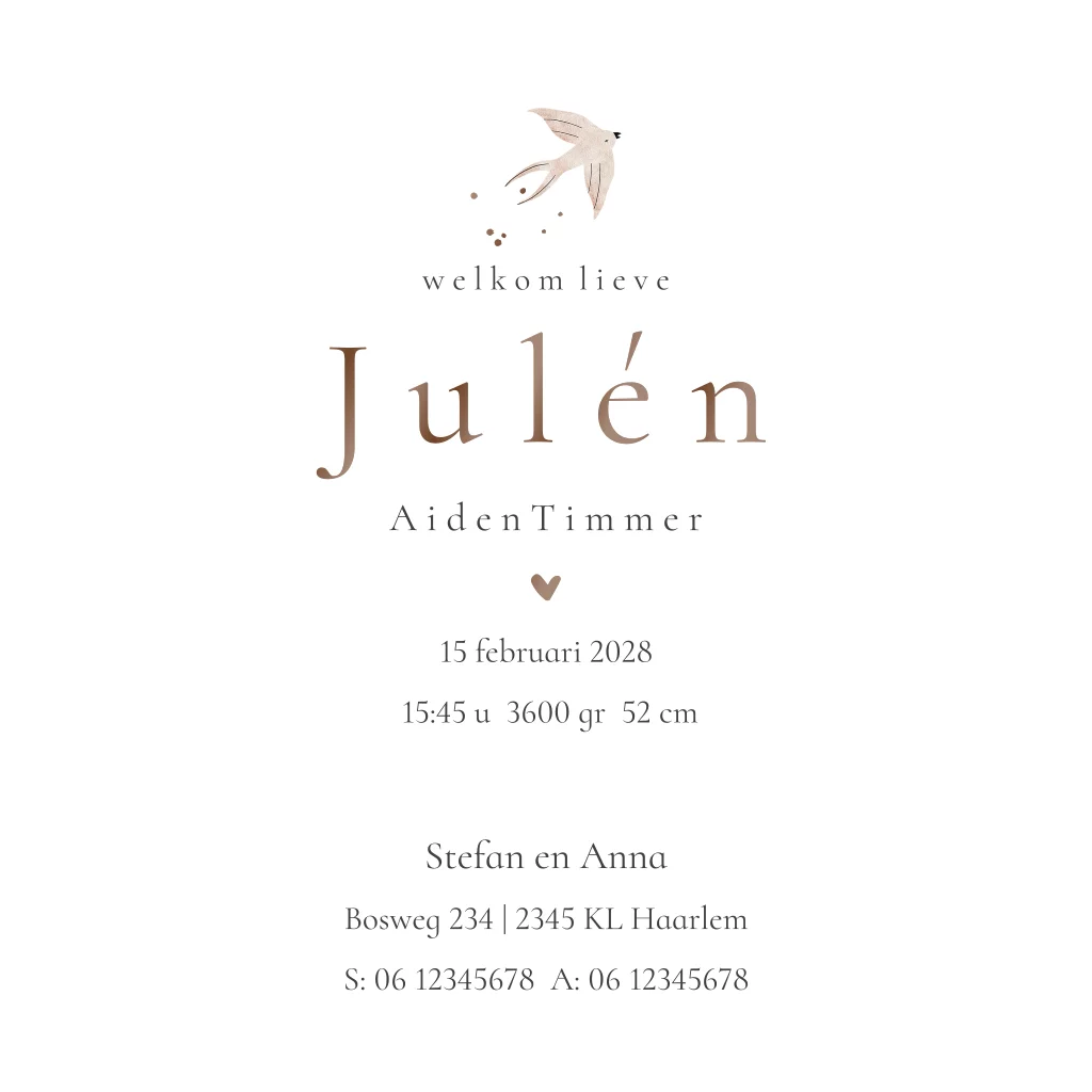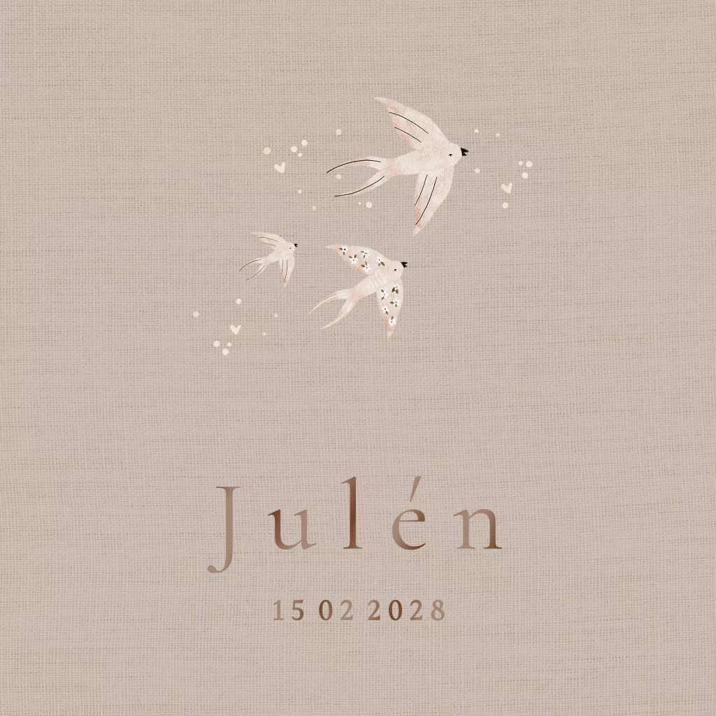 Neutraal geboortekaartje voor een jongen met vogels en foliedruk op linnen. Origineel met de zwaluwen familie en hartjes op de bruine neutrale achtergrond kleur, ontwerp met een klassieke uitstraling. je kan zelf de folie kleur aanpassen of omzetten naar goudfolie. Compleet te bestellen met een raambord , sluitzegel en poster op maat in de stijl van het geboortekaartje voor de babykamer.