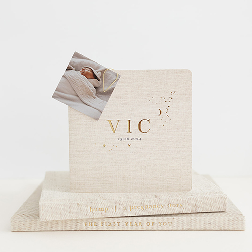 Minimalistisch geboortekaartje voor een jongen. De goudfolie babynaam op de trend linnen achtergrond is stijlvol en luxe. Je kan zelf de details en de folie kleur online aanpassen in de ontwerptool en met illustraties uit de mappen. Dit ontwerp is ook heel geschikt voor een meisje.