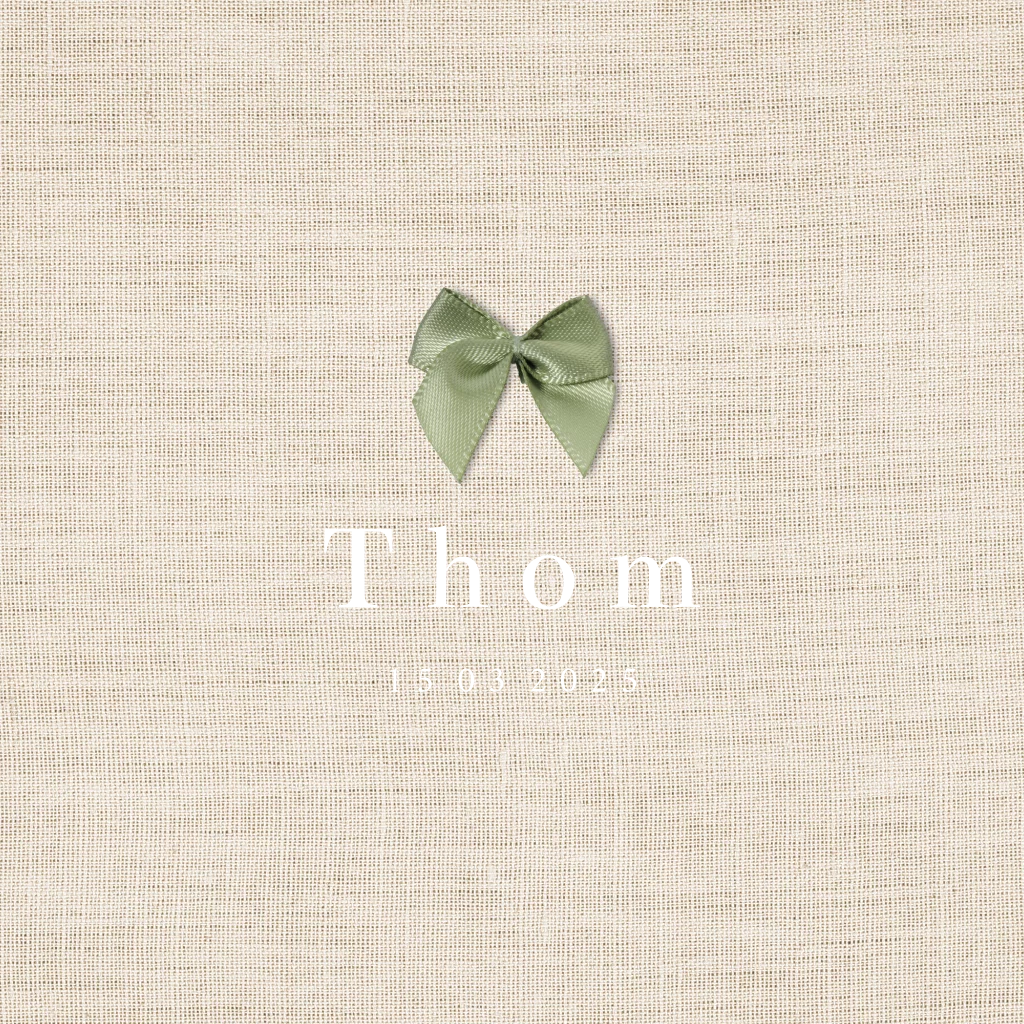 Klassiek geboortekaartje voor een jongen met linnenlook achtergrond en een echt strikje. De naam staat in goudfolie, dit kan je eenvoudig zelf aanpassen in de editor. Je kan een sample setje met strikjes bij de proefdruk bestellen en bij de oplage de strikjes los erbij bestellen. Door de plakstrip op de achterkant van het strikje is deze eenvoudig te bevestigen op het geboortekaartje.