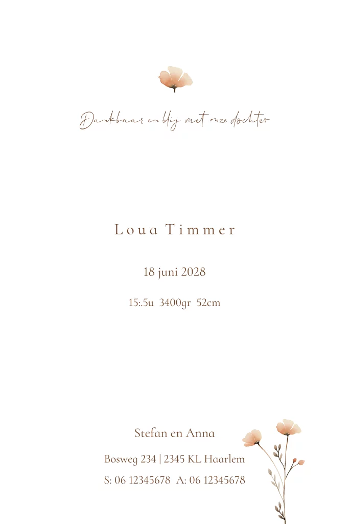 Geboortekaartje voor een meisje met zomerse bloemen op een neutrale achtergrond. De naam in rosefolie kan je eenvoudig aanpassen naar een ander foliekleur. Wil je liever een ander formaat , dan kan dat natuurlijk ook ! Het babykaartje van jullie dochter kan je extra mooi verzenden met een sluitzegel in dezelfde stijl. Leuk om een bijpassende poster te bestellen voor de babykamer. En een raambord voor de geboorteaankondiging