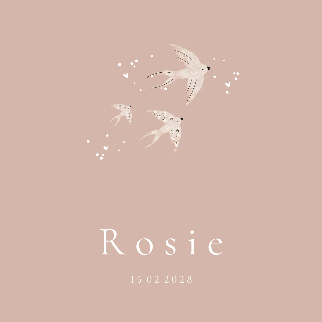 Geboortekaartje meisje met vogels en luxe rose foliedruk