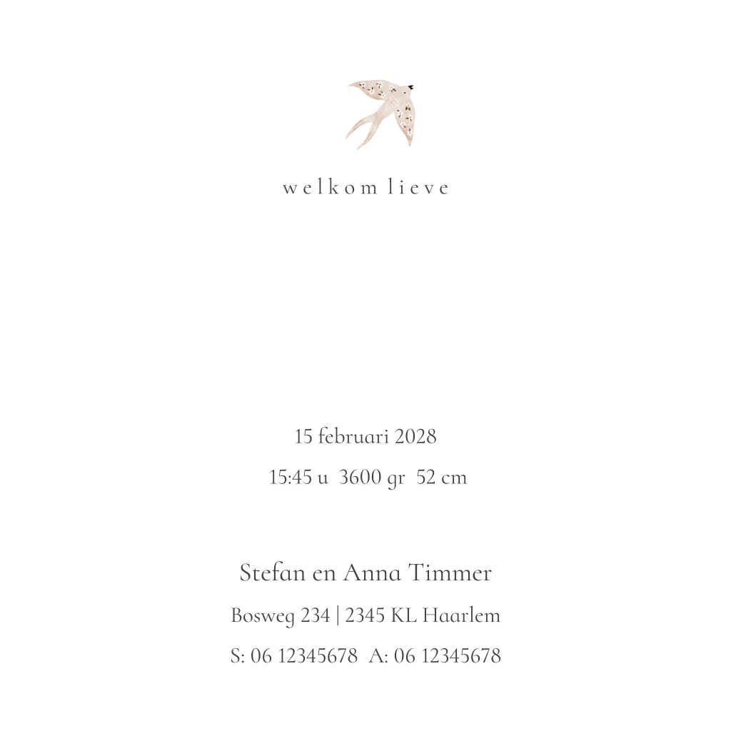 Lief geboortekaartje voor een meisje met vogels en luxe foliedruk . Origineel met de zwaluwen familie en hartjes op de neutrale achtergrond kleur. je kan zelf de folie kleur aanpassen of omzetten naar goudfolie. Compleet te bestellen met een raambord , sluitzegel en poster op maat in de stijl van het geboortekaartje voor de babykamer.
