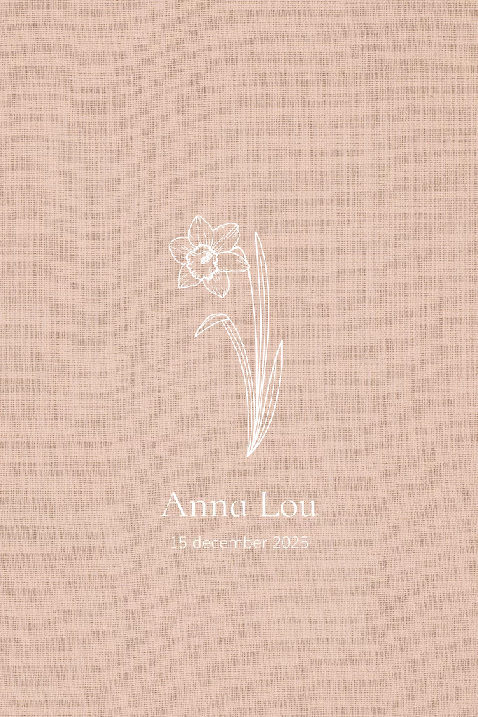 Geboortekaartje met de geboortebloem van december narcis. Alle geboortebloemen staan in de ontwerptool, je kan dit ontwerp zelf aanpassen met de bloem voor jullie kindje. De goudfolie naam op een linnen achtergrond is stijlvol en klassiek. Leuk om een bijpassende poster te bestellen voor de babykamer.