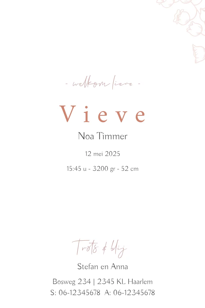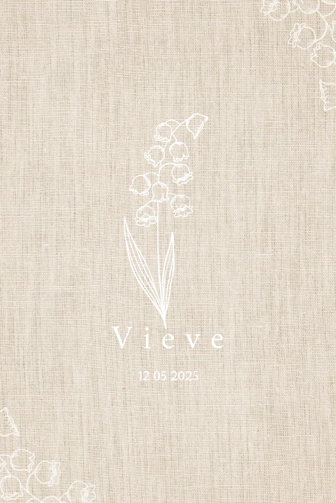 Geboortekaartje met de geboortebloem van mei , het Lelietje van Dalen. Alle geboortebloemen staan in de ontwerptool, je kan dit ontwerp zelf aanpassen met de bloem voor jullie kindje. De goudfolie naam op een linnen achtergrond is stijlvol en klassiek. Leuk om een bijpassende poster te bestellen voor de babykamer.