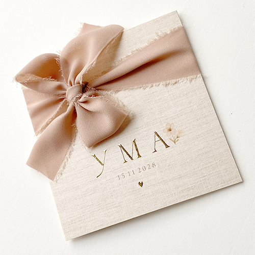 Mooi klassiek geboortekaartje voor een meisje met goudfolie en linnen. Lief met het bloemetje en een echte zijden strik. Het zijden lint voor de strik kan je los bestellen via de website. Deze wordt niet automatisch meegeleverd. je hebt ongeveer 50 cm - 60 cm nodig per kaartje voor een strik. Met 1 rol van 20 meter heb je voldoende voor ongeveer 40 kaartjes formaat 13 x 13 cm (afhankelijk van de grote van je strikje)
