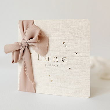 Klassiek geboortekaartje voor een meisje met hartjes in goudfolie op linnen. Mooi te combineren met een zijden lint strikje. Het lint kan je los bij het geboortekaartje bestellen, je hebt ongeveer 50 - 60 cm nodig per kaartje. Afhankelijk van de grootte van de strik. Tip: meet op hoeveel cm je gebruikt bij de proefdruk. De meisjesnaam staat in goudfolie gedrukt, dit kan je eenvoudig zelf aanpassen. Met een lief gedichtje op de binnenkant