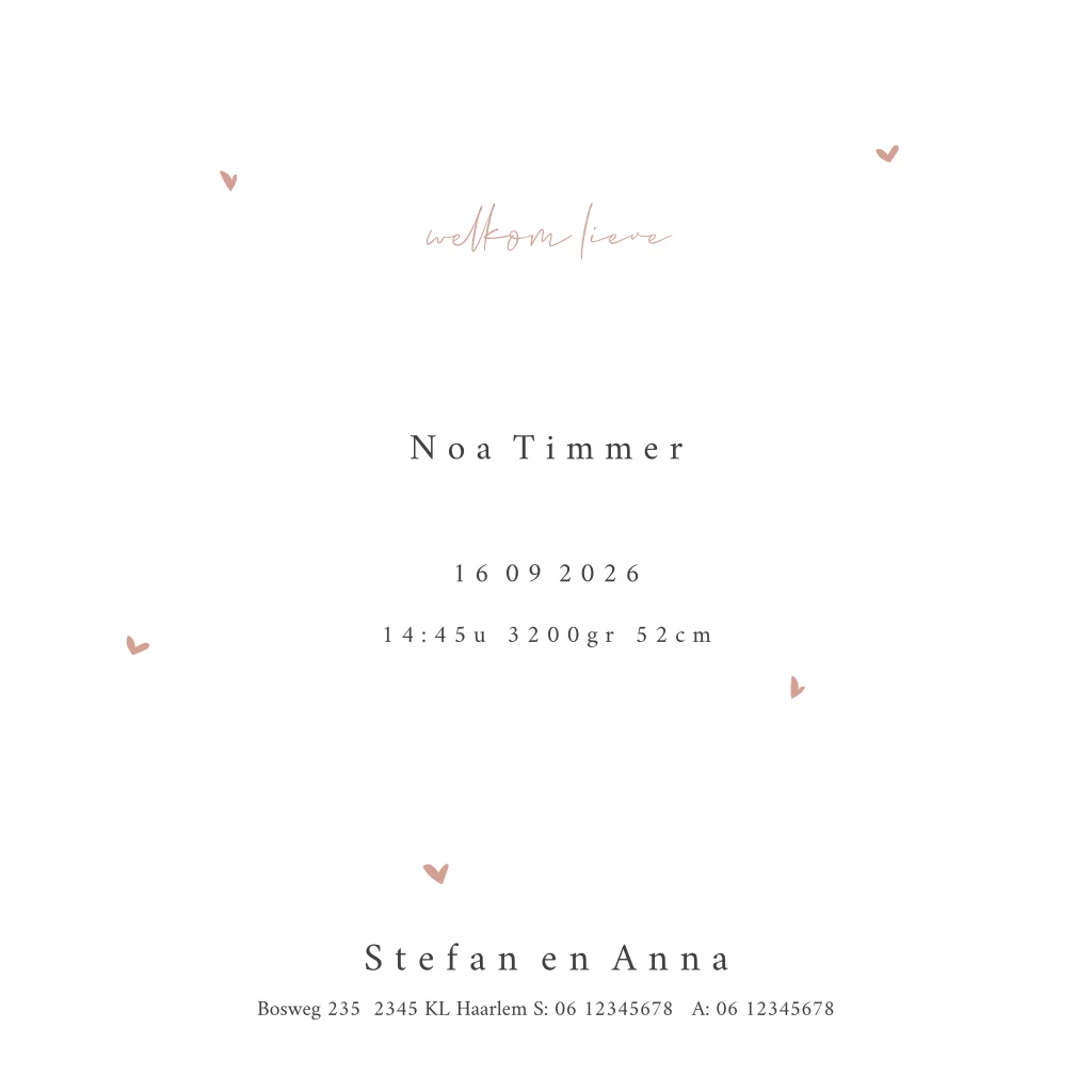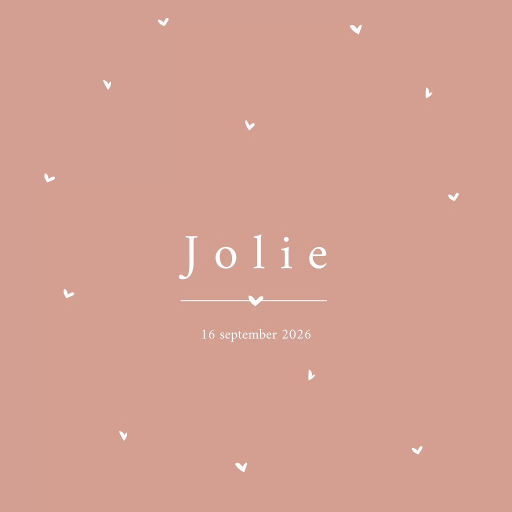 Een origineel minimalistisch geboortekaartje voor een meisje. Met rozerode achtergrond die je eenvoudig qua kleur kan aanpassen. De goudfolie hartjes geven een luxe uitstraling aan dit bijzondere ontwerp. Je kan een bijpassend raambord, kraambezoekboek, sluitzegel en poster bestellen.