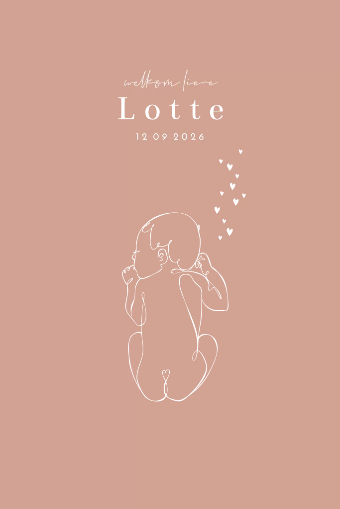 De trend van nu , velvet in een mooie warme aardetint met een baby lijntekening in goudfolie. De hartjes maken dit geboortekaartje voor een meisje extra lief. Ontwerp : Lotte