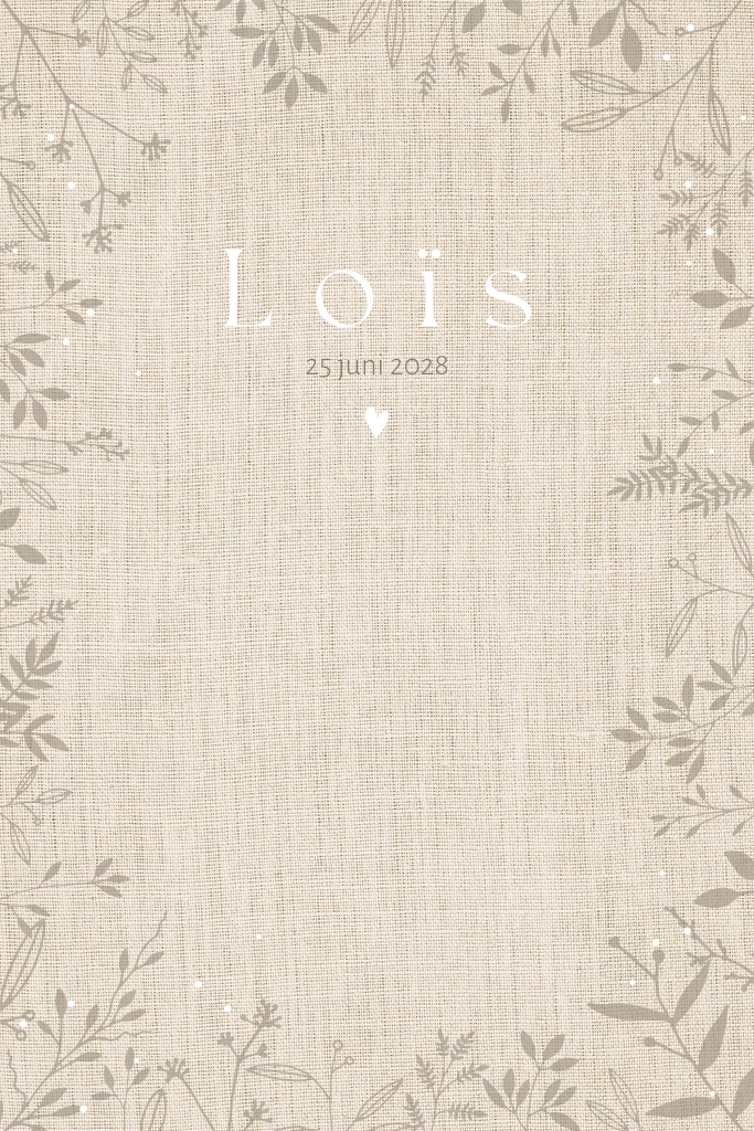 Geboortekaartje voor een meisje met bloemen en goudfolie. De linnen achtergrond geeft een klassieke en luxe uitstraling aan dit mooie geboortekaartje. je kan eenvoudig zelf de details aanpassen.