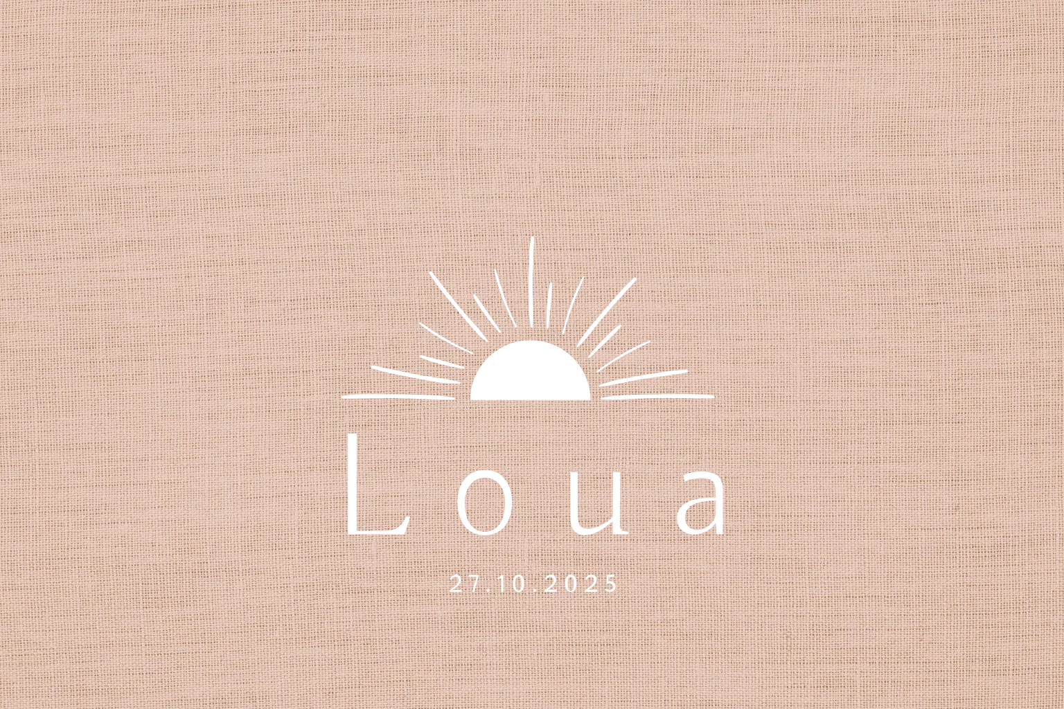 Een minimalistisch origineel geboortekaartje voor een meisje met roze linnen achtergrond. Gedrukt op structuur papier met rosefolie details en de zon een heel bijzonder en stijlvol kaartje. Leuk met een babyfoto van jullie dochter vastgemaakt met een hippe gouden druppelclip. Ontwerp: Loua