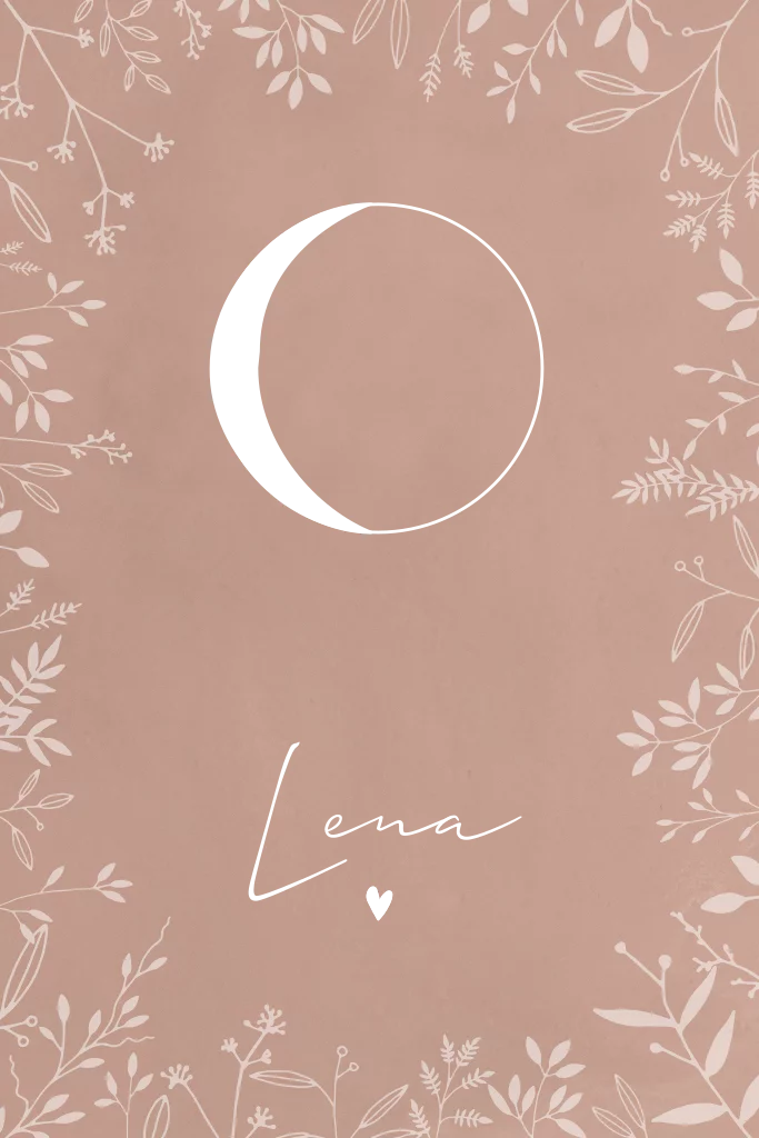 Bijzonder origineel geboortekaartje voor een meisje met de maanstand van de geboortedag in rosefolie. De bloemen en velvet look achtergrond staan heel mooi in combinatie met de foliedruk. Je kan het kaartje zelf in de editor personaliseren