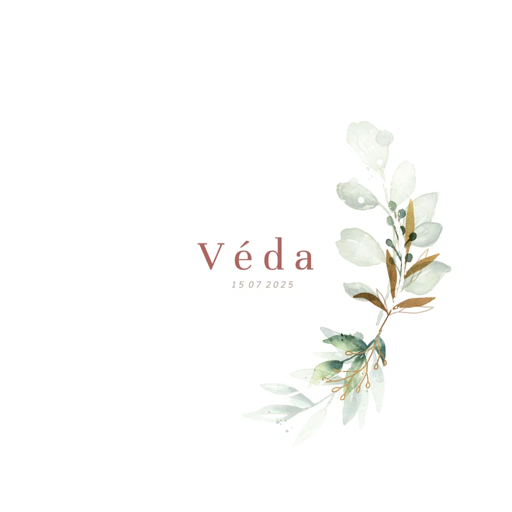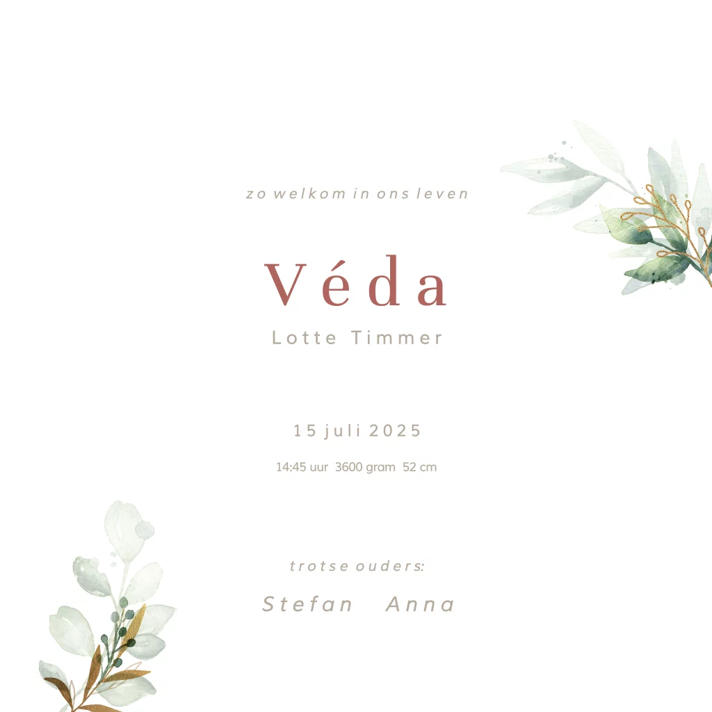 Lief geboortekaartje voor een meisje met bloemen en goudfolie naamcirkel.De illustraties hebben een mooie klassieke uitstraling. Het geboortegedichtje op de binnenkant maakt het kaartje helemaal af!