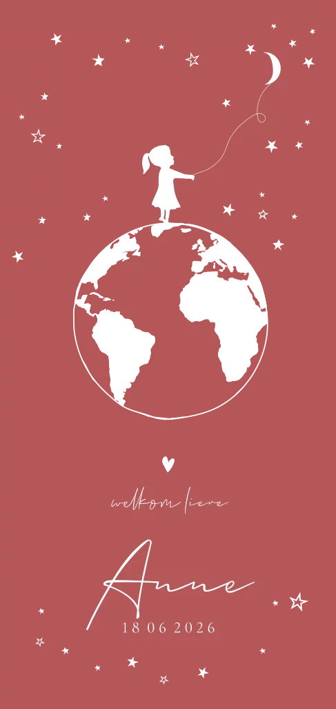 De warme natural rood kleur past mooi bij de foliedruk en is weer eens wat anders dan roze:) bij dit ontwerp staat ook de rosegoud achtergrond heel gaaf ! Die kan je in de illustratie map vinden. De wereldbol in goudfolie en het silhouet van een meisje is origineel met de maan als ballon. Wil je er een broertje of zusje bij plaatsen ? Die staan klaar in de illustratie map en zijn eenvoudig toe te voegen. Lief met hartjes en sterretjes in foliedruk. Let op ! extra foliedruk details toevoegen? neem contact op met klantenservice vóór je de bestelling plaats, deze moeten wij voor je omzetten naar folie.