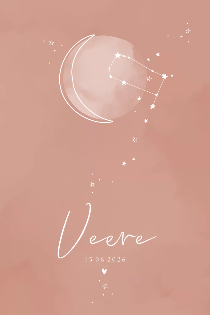 Origineel geboortekaartje voor een meisje met het sterrenbeeld en de maanstand in goudfolie. Je kan zelf het juiste sterrenbeeld en de maanstand in het geboortekaartje zetten. Heb je hierbij hulp nodig? neem gerust contact met ons op ! Ook mooi als poster voor in de babykamer:) Op de binnenkant staat een lief geboortedichtje.