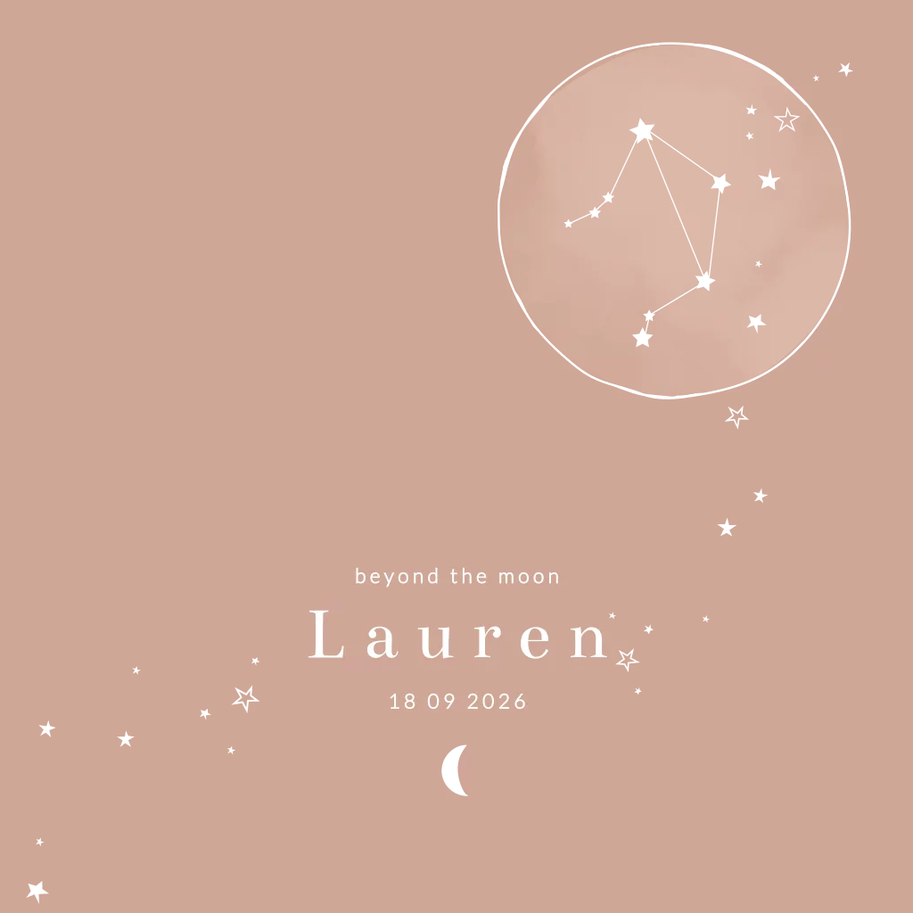 Bijzonder origineel babykaartje met diverse elementen. Zo Mooi combineert de maanfase waarin jullie kindje is geboren met het sterrenbeeld voor een uniek ontwerp.