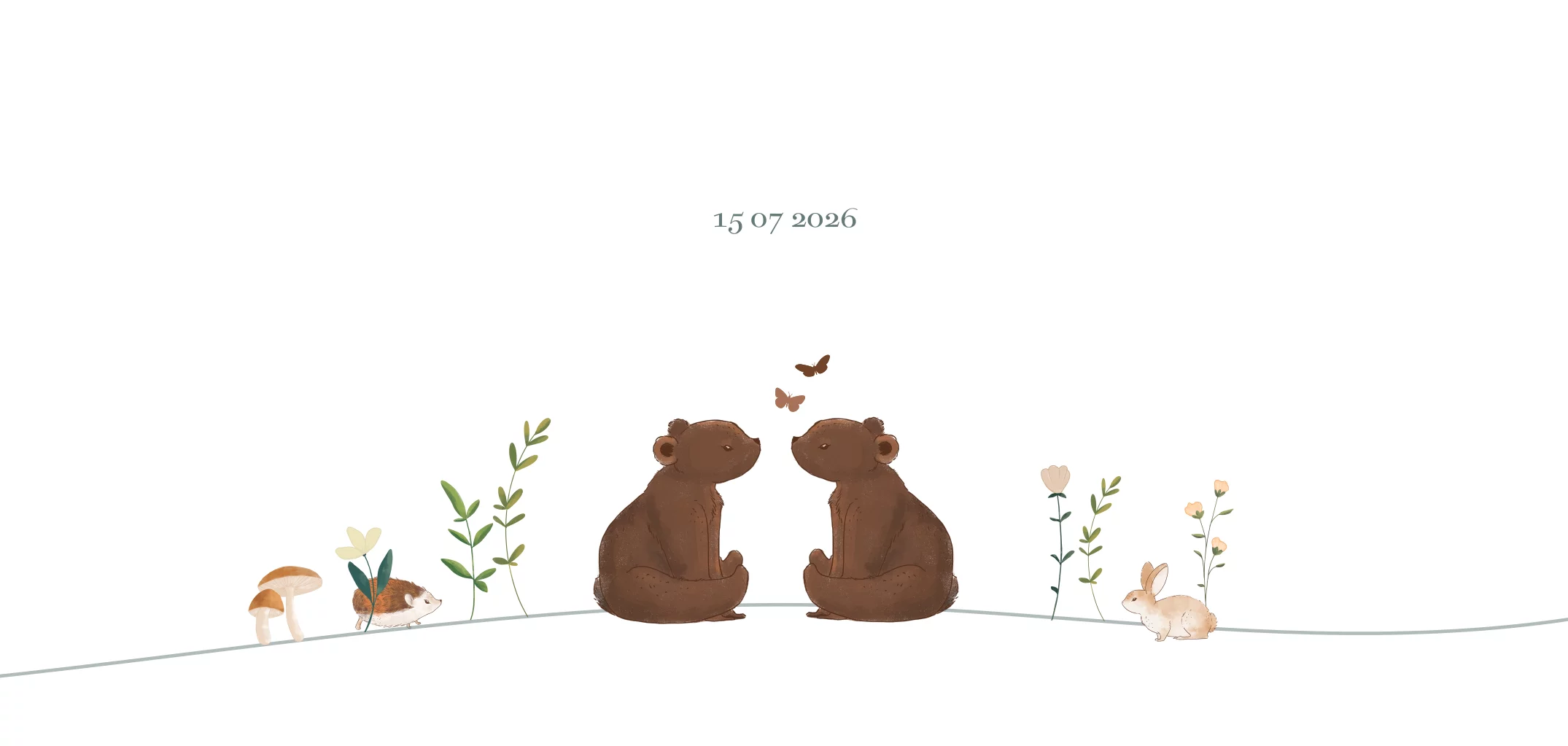 Origineel zomers geboortekaartje met bloemen en bosdieren illustraties voor een tweeling jongens. De beren familie en bosdieren maken het kaartje extra bijzonder. De dieren staan ook in de illustratie mappen. Je kan de gegevens aanpassen en zo zelf je geboortekaartje ontwerpen.De babynaam in goudfolie geeft het geboortekaartje een luxe uitstraling. Ook mooi als poster voor de babykamer !