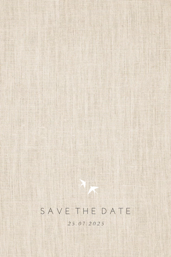 Mooie luxe Save the date uitnodiging met goudfolie zwaluw details op een trend linnen achtergrond. Kondig jullie bruiloft aan met de bijpassende trouwkaart en maak de dag compleet met de huisstijl menukaart, naamkaart en bedankje. Wil je liever koperfolie of een andere achtergrondkleur? dat is eenvoudig aan te passen in de ontwerptool. Hulp nodig? Neem gerust contact op.