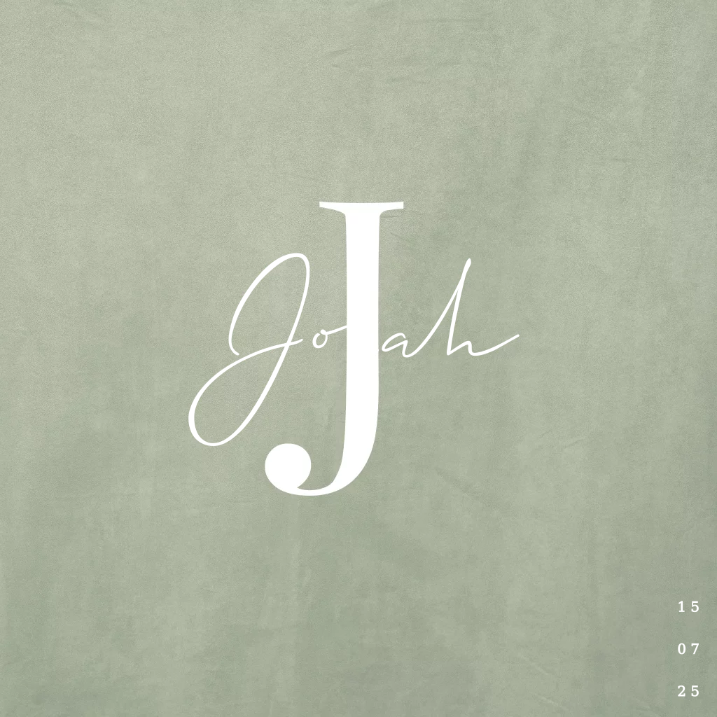 Stoer minimalistisch geboortekaartje voor een jongen met een trend kleur groen velvet achtergrond. Leuk met het initiaal op de voorkant , eenvoudig zelf aan te passen
