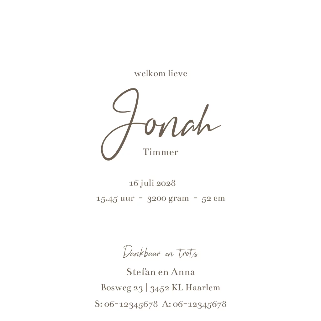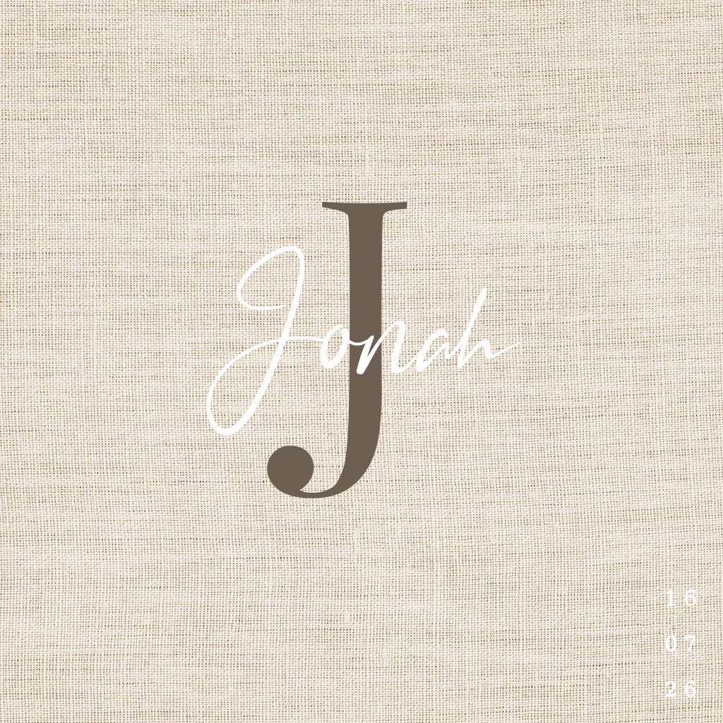 Stoer minimalistisch geboortekaartje voor een jongen met een klassieke linnen achtergrond en de jongensnaam in goudfolie. Een origineel geboorte gedichtje op de binnenkant. Je kan eenvoudig de tekst op dit geboortekaartje zelf aanpassen in de online ontwerp tool.