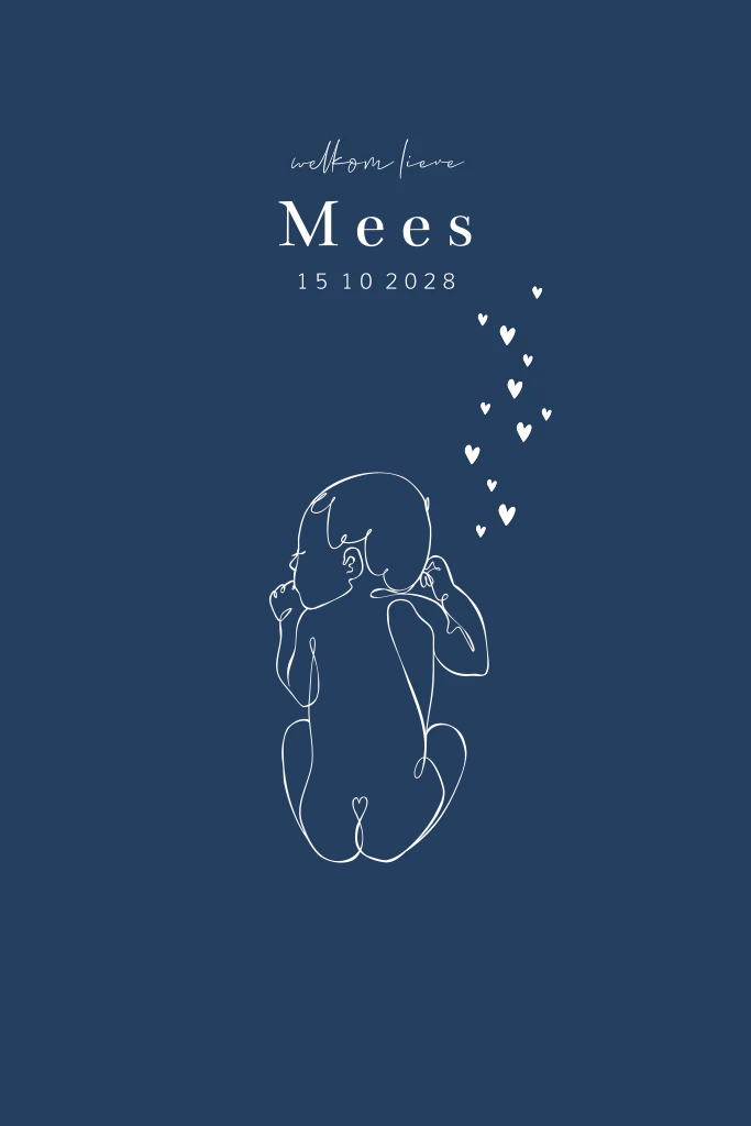 Tijdloos lief geboortekaartje voor een jongen met een baby lijntekening illustratie in goudfolie. De rest van het ontwerp is minimalistisch . Je kan zelf de folie kleur aanpassen.