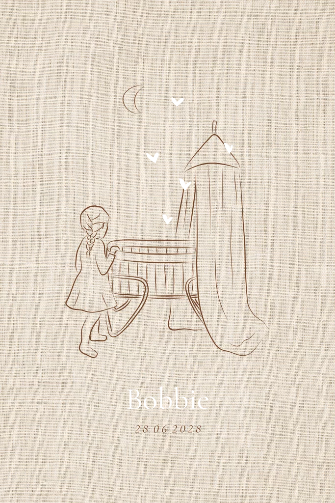 Minimalistisch neutraal geboortekaartje voor een jongen of meisje met een lijntekening wiegje en zusje op een vezellook achtergrond. De hartjes en babynaam in hoogglans folie . Je kan eenvoudig de tekst en het lettertype aanpassen. Wil je een aanpassing in de tekening ? Geef je wensen door en wij passen het gratis voor je aan. Je kan de sluitzegels en het raambord in dezelfde stijl als het geboortekaartje vooraf bestellen. Leuk ook een poster op canvas voor de babykamer. Mooi gedichtje op de achterzijde.
