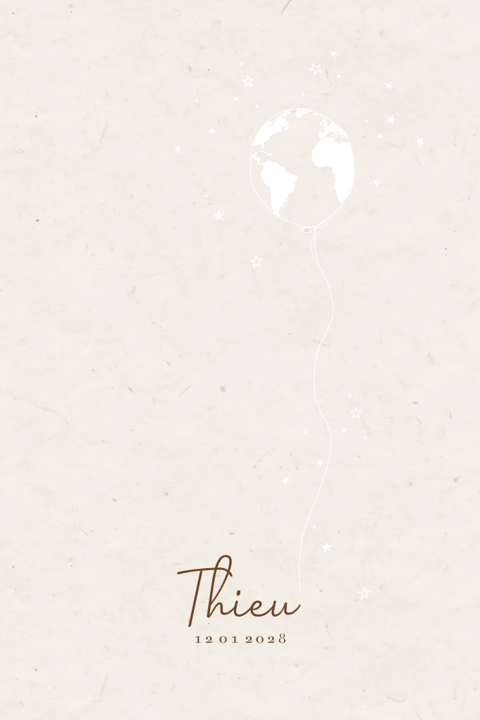Stoer geboortekaartje voor een jongen met de wereldbol in een ballon, de sterretjes in goudfolie. Je kan zelf ook bijvoorbeeld de babynaam of de wereldbol aanpassen naar goudfolie.