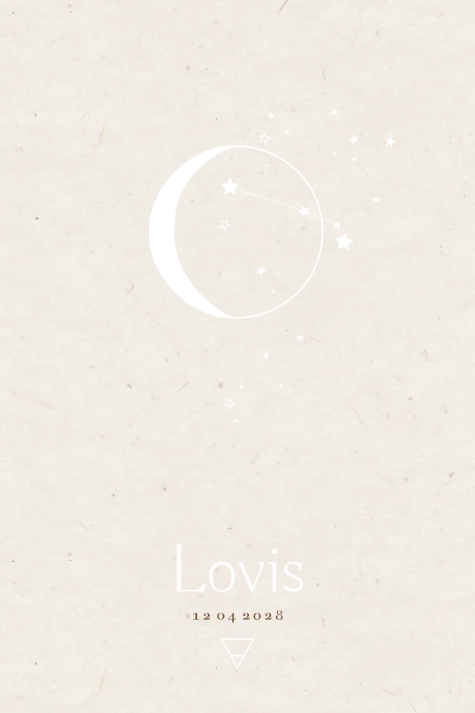 Stoer geboortekaartje met vezellook achtergrond en koperfolie maan. Het sterrenbeeld van jullie zoon maakt het ontwerp extra origineel. Liever ook foliedruk op de achterkant? Dat is eenvoudig aan te passen !