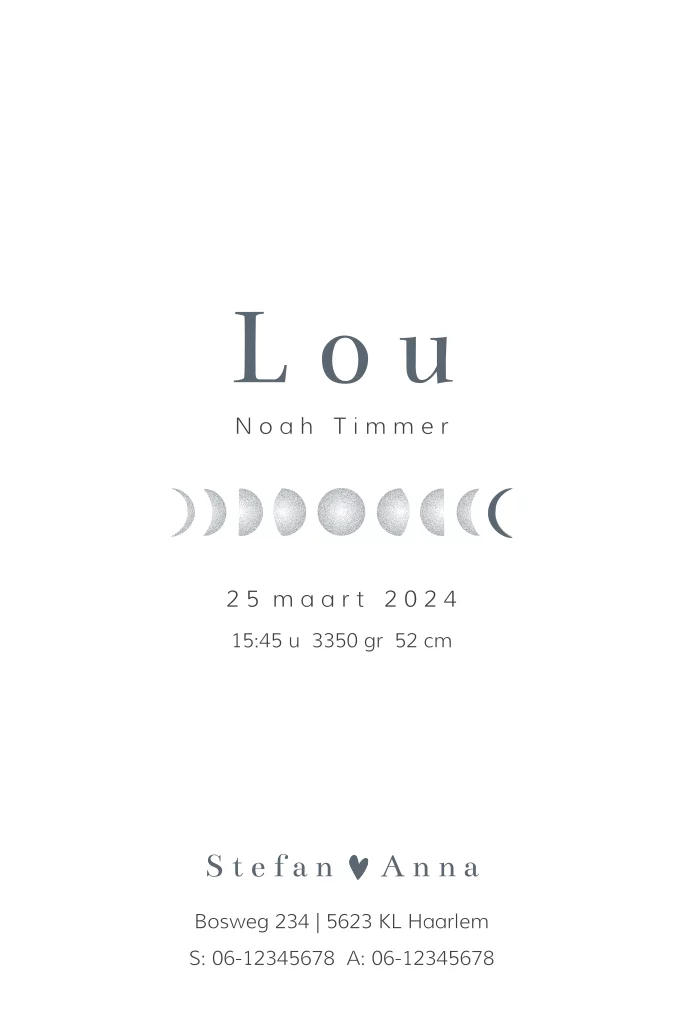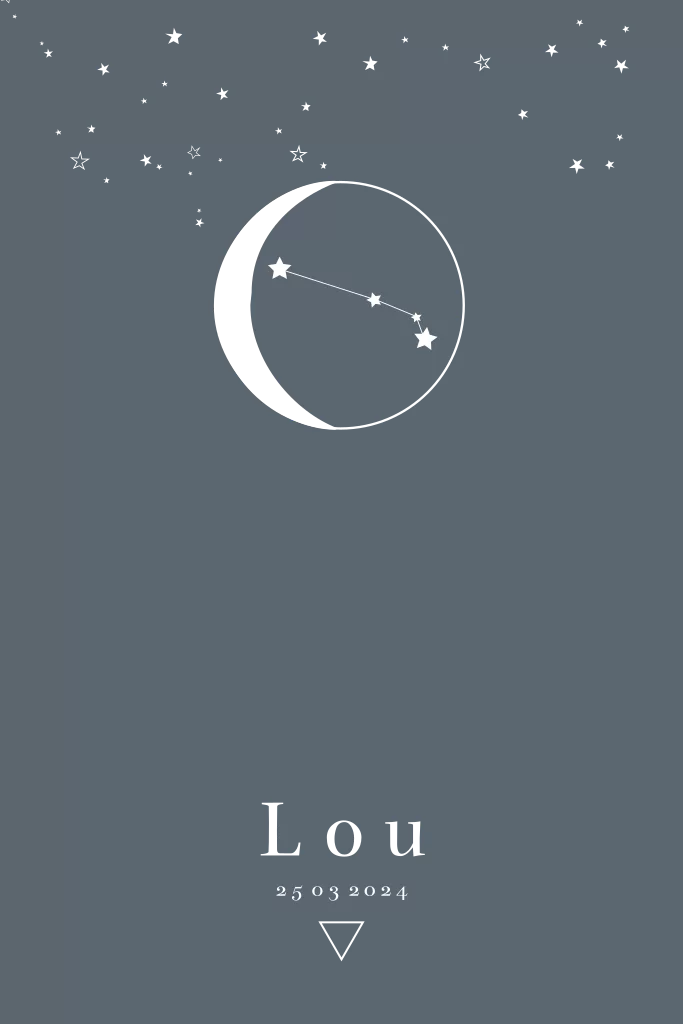 Stoer geboortekaartje met denimblue achtergrond en goudfolie maan. Het sterrenbeeld van jullie zoon maakt het ontwerp extra origineel. Liever ook foliedruk op de binnekant? Dat kan je zelf eenvoudig in de ontwerptool aanpassen.