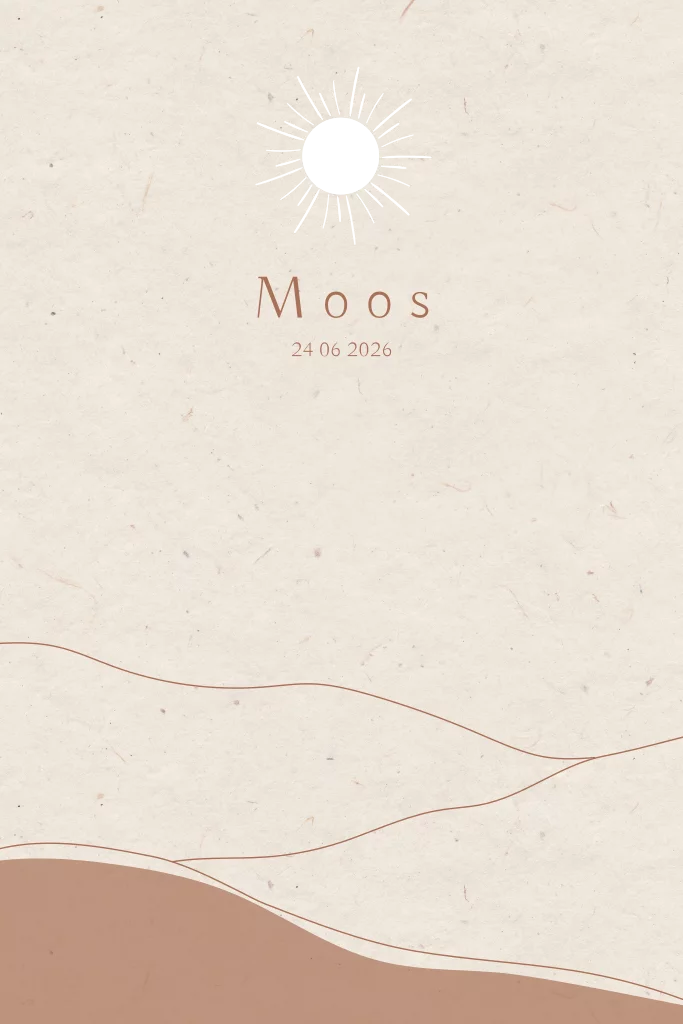 Origineel geboortekaartje voor een jongen met goudfolie zon en en minimalistische zee, de vogels op de achterkant en de geboortetekst staan heel mooi bij de vezelstructuur achtergrond. Je kan het ontwerp zelf aanpassen.