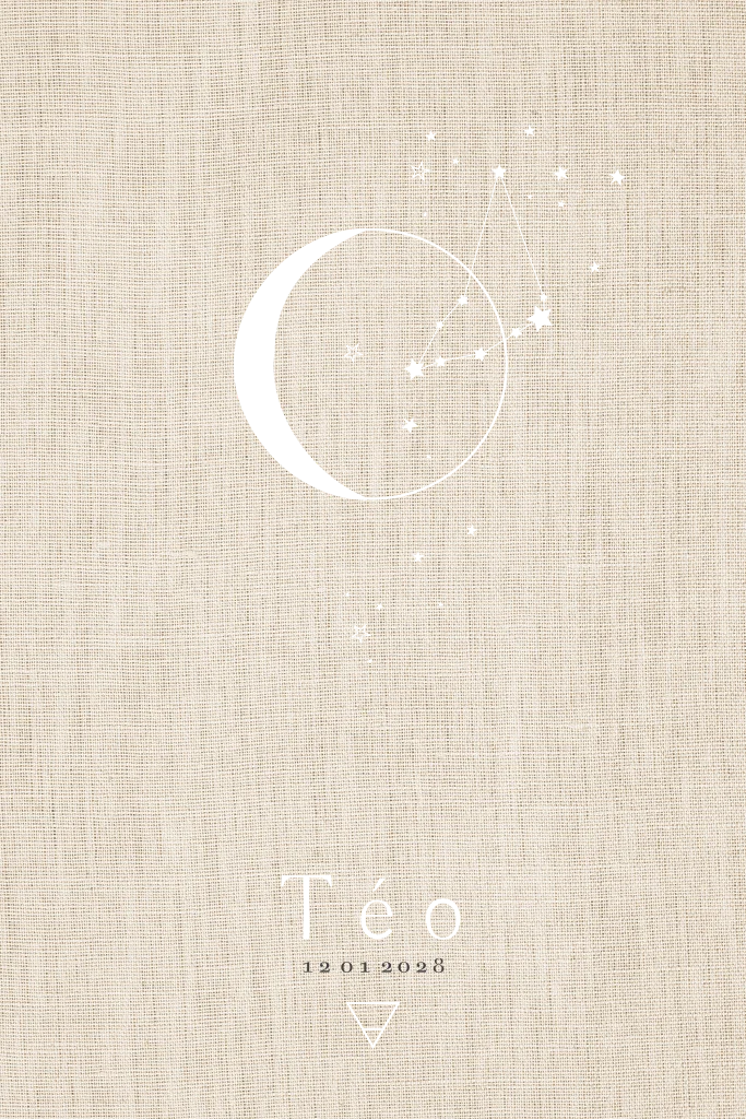 Stoer geboortekaartje met linnenlook achtergrond en goudfolie maan. Het sterrenbeeld van jullie zoon maakt het ontwerp extra origineel. Liever ook foliedruk op de achterkant? Dat is eenvoudig aan te passen !