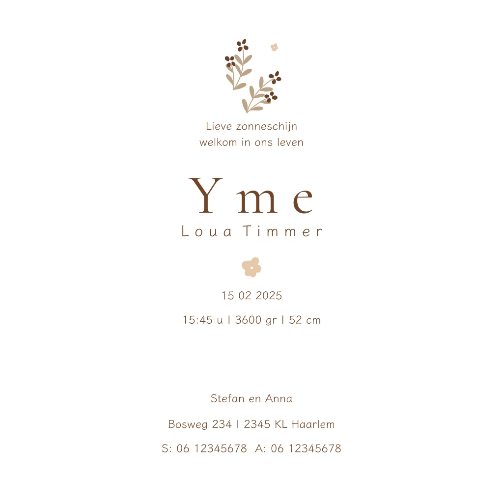 Lief nostalgisch geboortekaartje met bloemen patroon voor een meisje met koperfolie naam. De foliekleur van de babynaam kan je zelf aanpassen naar bijvoorbeeld goudfolie of rosefolie, beiden heel mooi in dit geboortekaartje. Op de binnenkant staat een lief geboortegedichtje. Leuk ok compleet te maken met een kraambezoekboek en een raambord op maat voor de geboorteaankondiging.