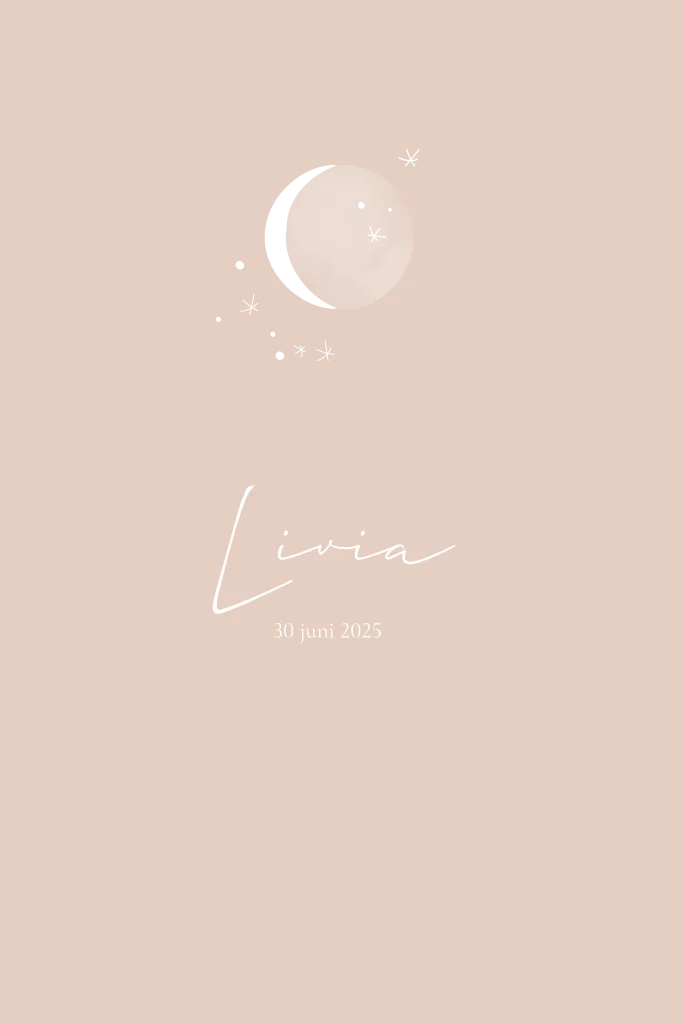 Bijzonder mooi geboortekaartje voor een meisje met de maanstand van de geboortedag. De subtiele sterren en maan in goudfolie geven het minimalistische kaartje een luxe en lieve uitstraling. Het sterrenbeeld staat op de achterkant. je kan eenvoudig de gegevens en de foliekleur aanpassen in onze editor. Heb je hulp nodig? neem gerust even contact op !