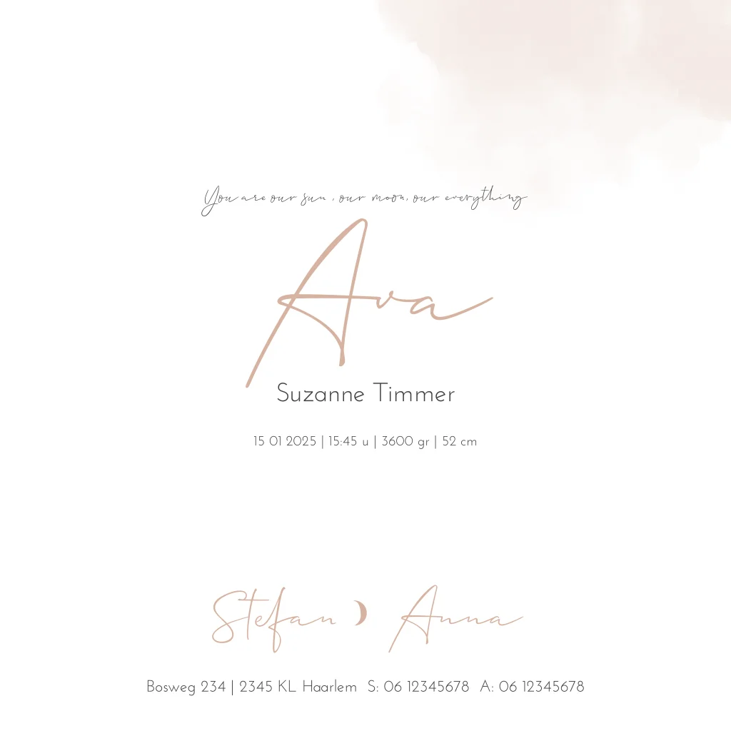Minimalistisch ontwerp met goudfolie naam is een echte eye-catcher. Je kan zelf de details en de folie kleur online aanpassen in de ontwerptool en met illustraties uit de mappen. Let op ! extra foliedruk details toevoegen? neem contact op met klantenservice vóór je besteld, deze moeten wij voor je omzetten naar folie.