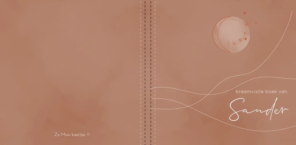 Kraambezoekboek voor een jongen met maan met sterretjes op de voorkant. Met stoere bruine achtergrond kleur, die je eenvoudig zelf naar wens kan aanpassen. De voorgedrukte pagina’s met vragen kan de kraamvisite invullen, leuk om terug te lezen en te bewaren voor je kindje ! Je kan ook bijpassende poster van het geboortekaartje bestellen voor de babykamer.