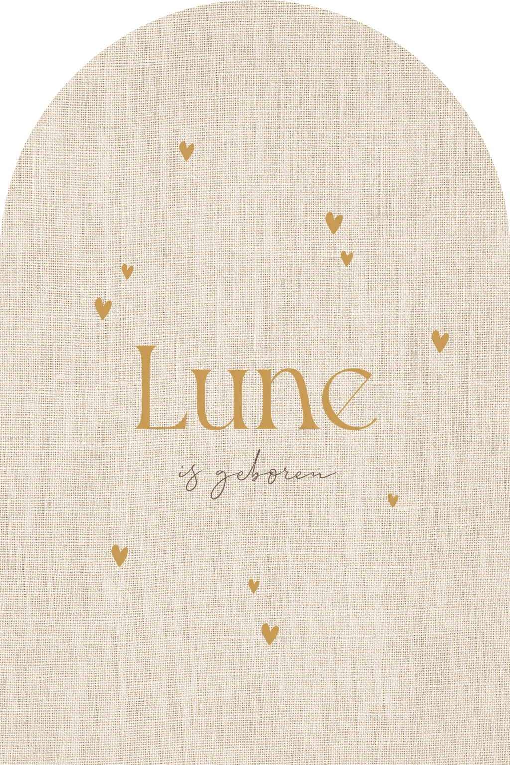 Dit geboortebord in boogvorm is een rustige en stijlvolle geboorte aankondiging voor de geboorte van jullie dochter. De linnenlook achtergrond, gecombineerd met de naam van het meisje en kleine hartjes, zorgt voor een tijdloze en klassieke uitstraling.let erop dat je beide zijdes van het bord aanpast.