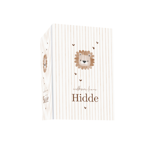 Dit geboortebord voor een jongen met leeuw heeft een achtergrond met strepen, een trend die nu veel gekozen wordt. De stoere leeuw in het midden geeft het ontwerp karakter, terwijl de naam alle aandacht krijgt.