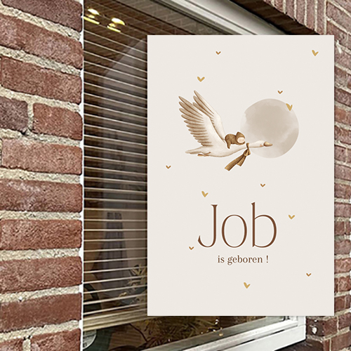Dit geboortebord jongen met een ooievaar en babietje is uitgevoerd in zachte neutrale kleuren met een rustige achtergrond. Een lief en zacht ontwerp waarin de naam van jullie zoon centraal staat.