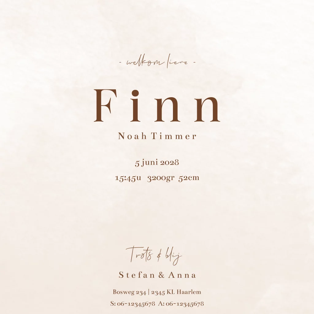 Neutraal lief geboortekaartje voor een jongen met een beertje. Je kan eenvoudig de achtergrondkleur, tekst en het lettertype aanpassen. En broertje of zusje beer toevoegen vanuit de beeldbank in de editor. Leuk met een raambord, kraambezoekboek en sluitzegel in dezelfde stijl als het geboortekaartje.