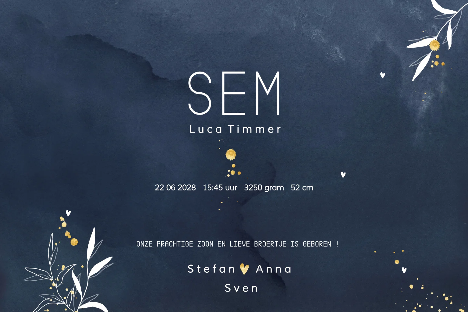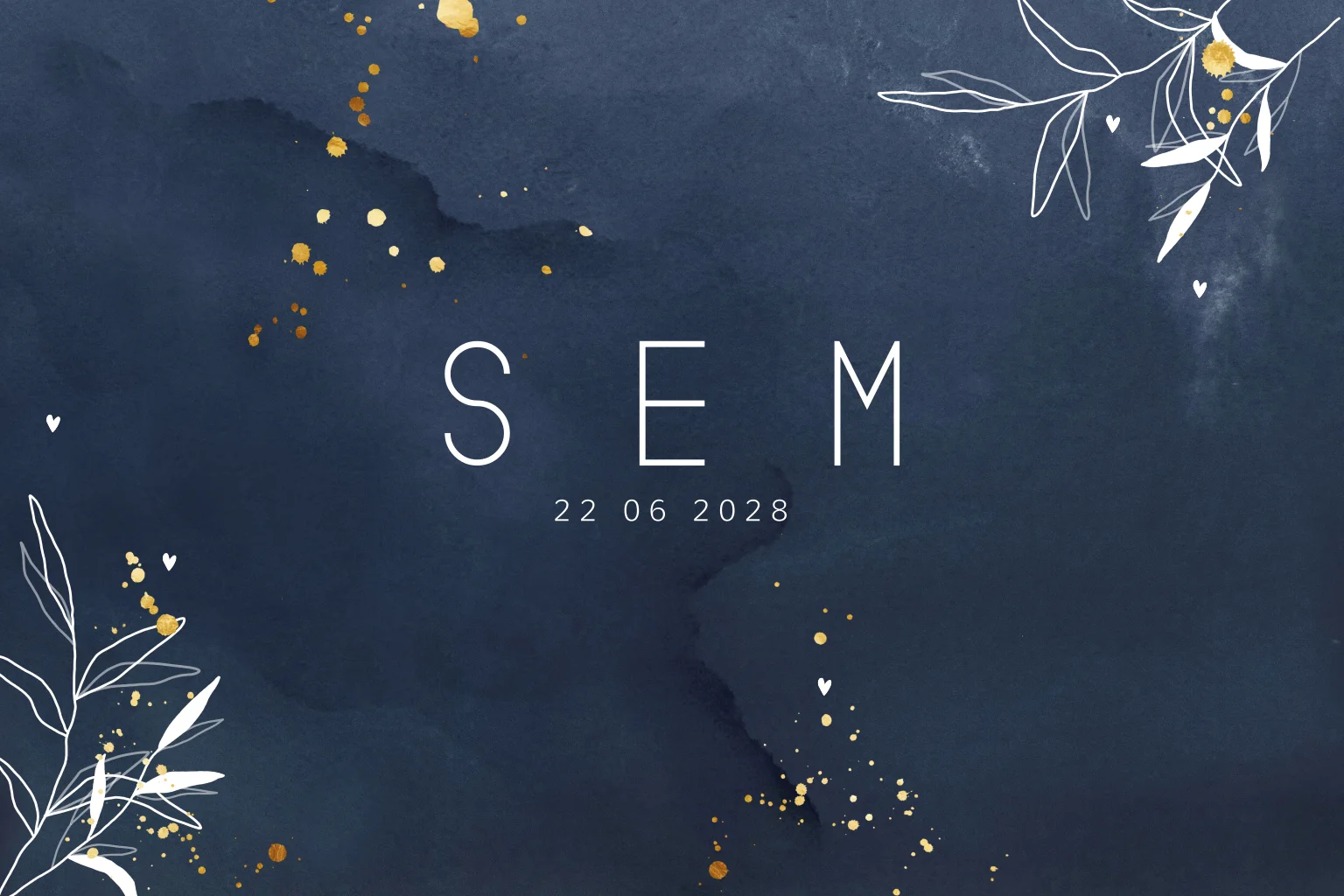 Dé trends van nu gecombineerd, de takjes illustraties tegen een donkerblauwe achtergrond. De subtiele hartjes en goudkleurige spetters maken dit geboortekaartje voor een jongen helemaal af. Dit dubbele formaat kan je mooi neerzetten ! Je kan de tekst zelf eenvoudig aanpassen, er is ruimte voor een gedichtje op de binnenkant.
