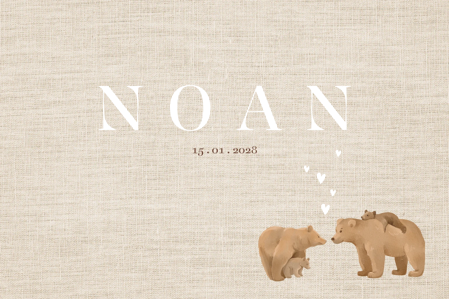 Dieren geboortekaartje voor een jongen met stoere linnen achtergrond en een beren familie. Je kan deze familie aanpassen voor een eerste kindje ! Er staan meerdere beren in de beeldbank. Je kan het geboortekaartje extra feestelijk verzenden met een sluitzegel op maat in de stijl van het kaartje. Hulp nodig? neem gerust contact met ons op!